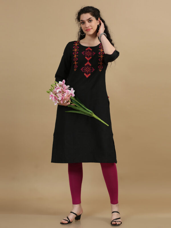 - 79 % Off Select options This product has multiple variants. The options may be chosen on the product page₹1,499.00Original price was: ₹1,499.00.₹320.00Current price is: ₹320.00.Indulge in the timeless elegance of the Marcia Black Embroidered Cotton Straight Kurta. This exquisite garment is a testament to understated sophistication and meticulous craftsmanship.