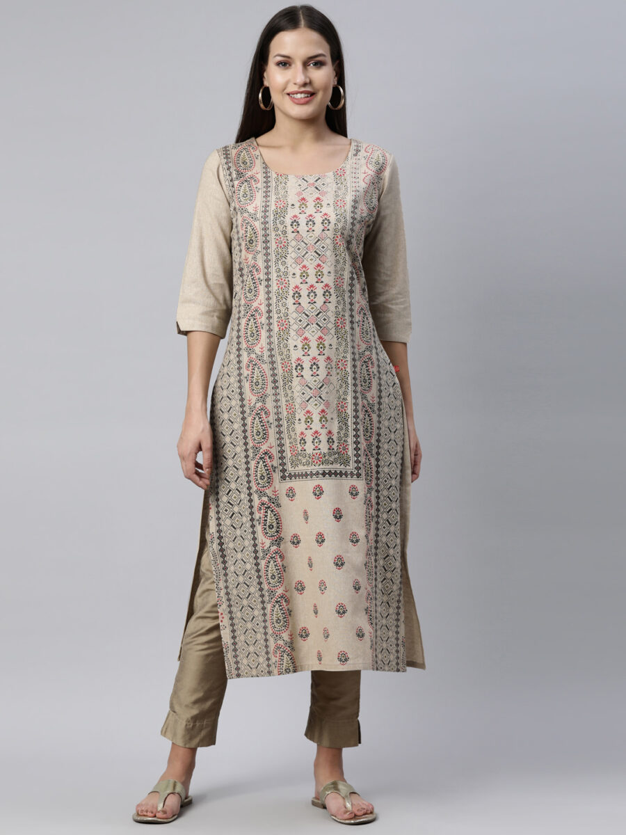 Embrace understated elegance with the Marcia Beige Printed Cotton Straight Kurta. This piece offers a perfect blend of classic style and everyday comfort, making it a versatile addition to your ethnic wardrobe.
