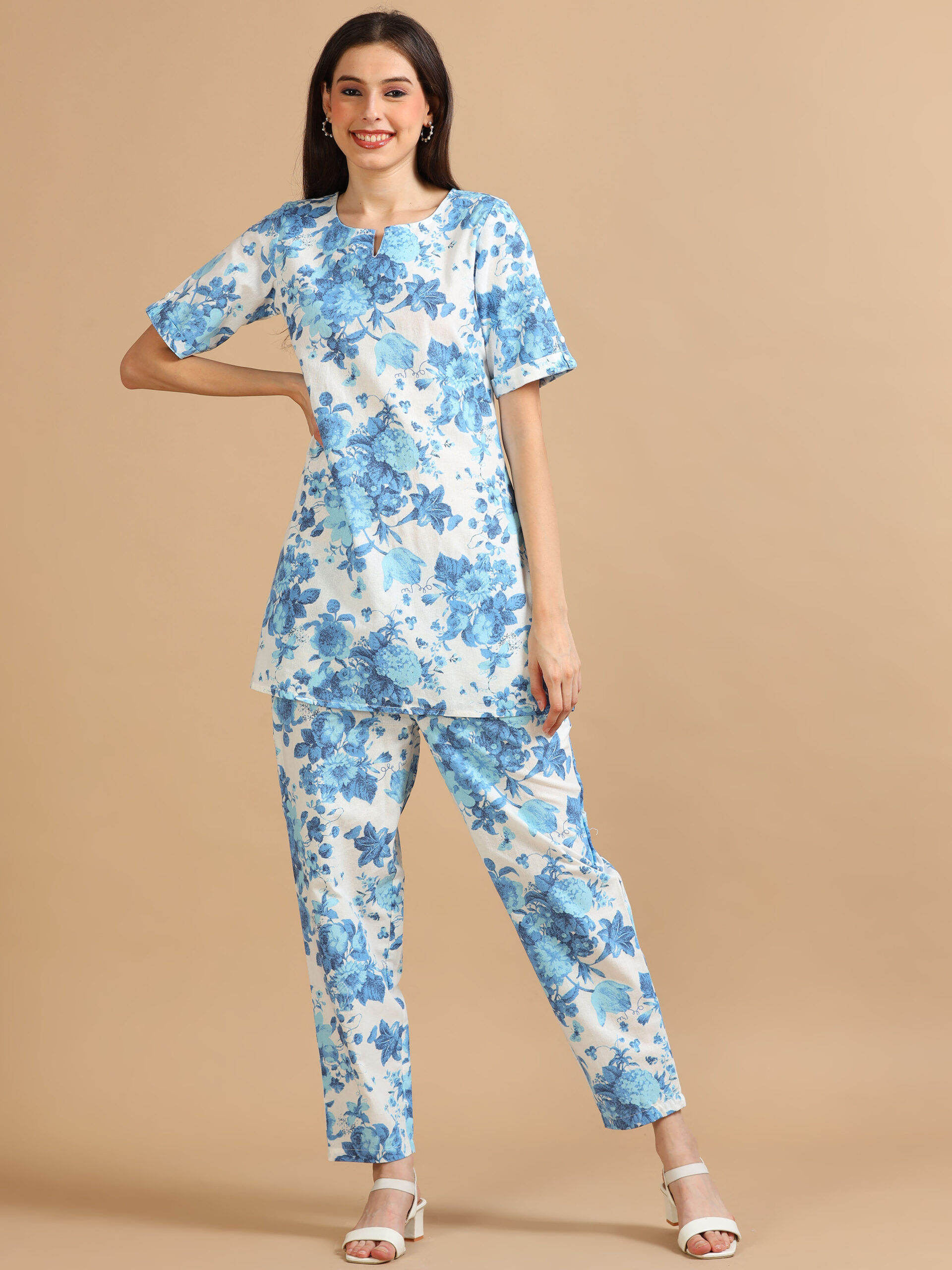 Experience a harmonious blend of style and comfort with the Marcia Blue Printed Cotton Co-Ord Set. This set offers a perfectly coordinated look, ideal for various casual settings.
