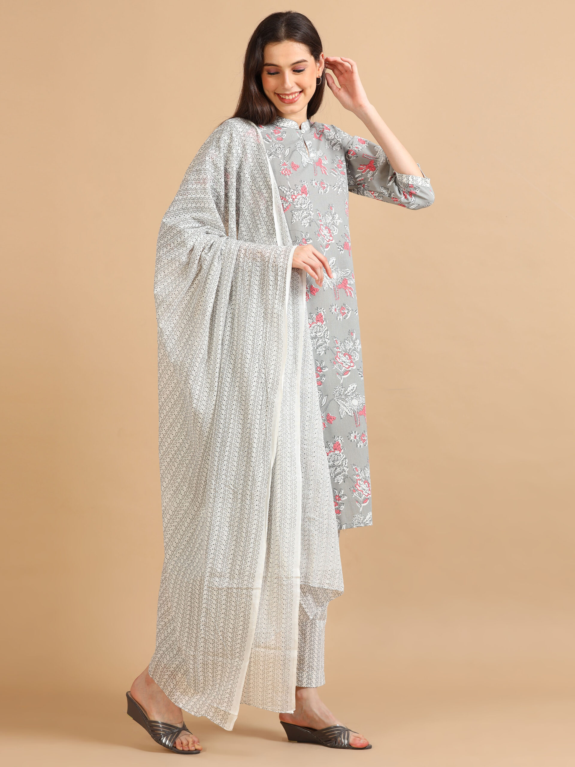 Marcia Grey Printed Cotton 3 Pc Kurta Set