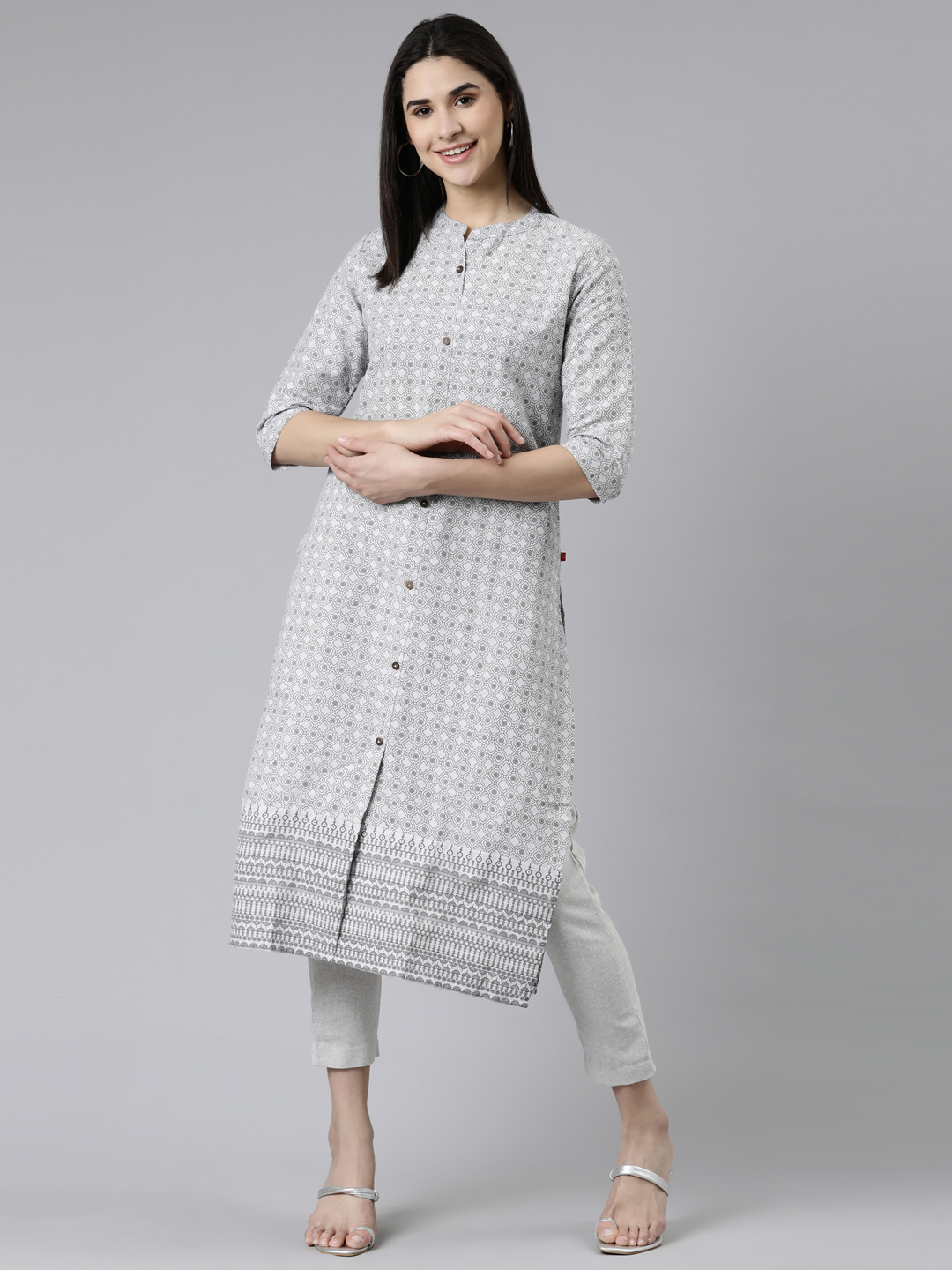Discover the perfect blend of comfort and style with the Marcia Grey Printed Cotton Straight Kurta Set. This versatile set includes a comfortable kurta and matching pants, making it ideal for both casual outings and festive occasions.