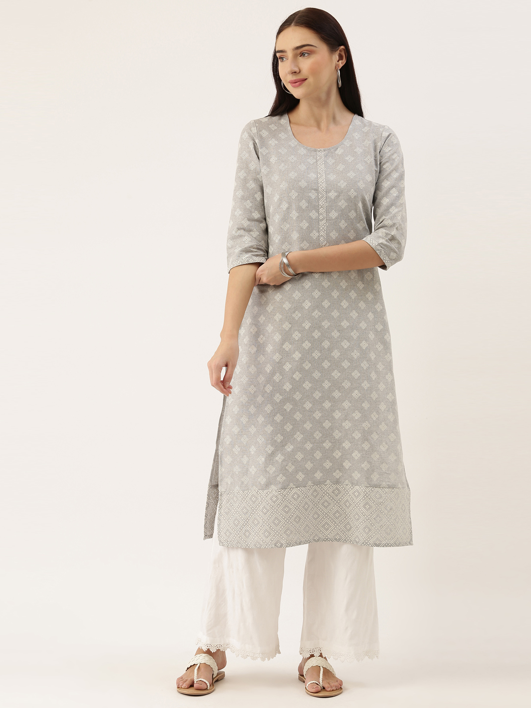 Experience the comfort and style of the Marcia Grey Printed Cotton Straight Long Kurta. Crafted from soft, breathable cotton, this kurta offers a relaxed fit and a casual look. The intricate printed design adds a touch of personality, making it perfect for everyday wear.