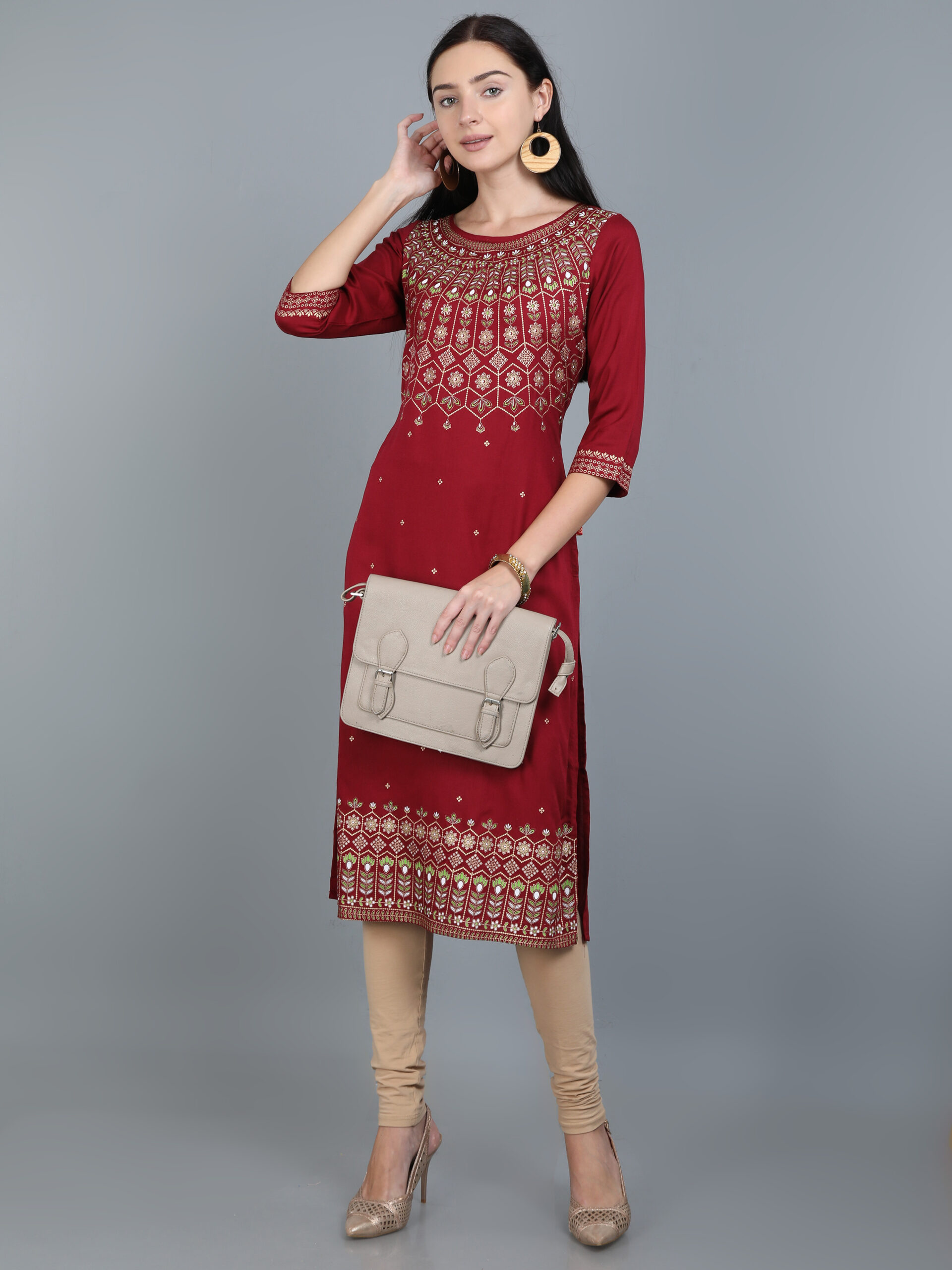 Indulge in the timeless elegance of the Marcia Maroon Printed Rayon Long Kurta. Crafted from soft, breathable rayon, this kurta offers a comfortable fit and a sophisticated look. The intricate printed design adds a touch of charm, making it perfect for both casual and festive occasions.