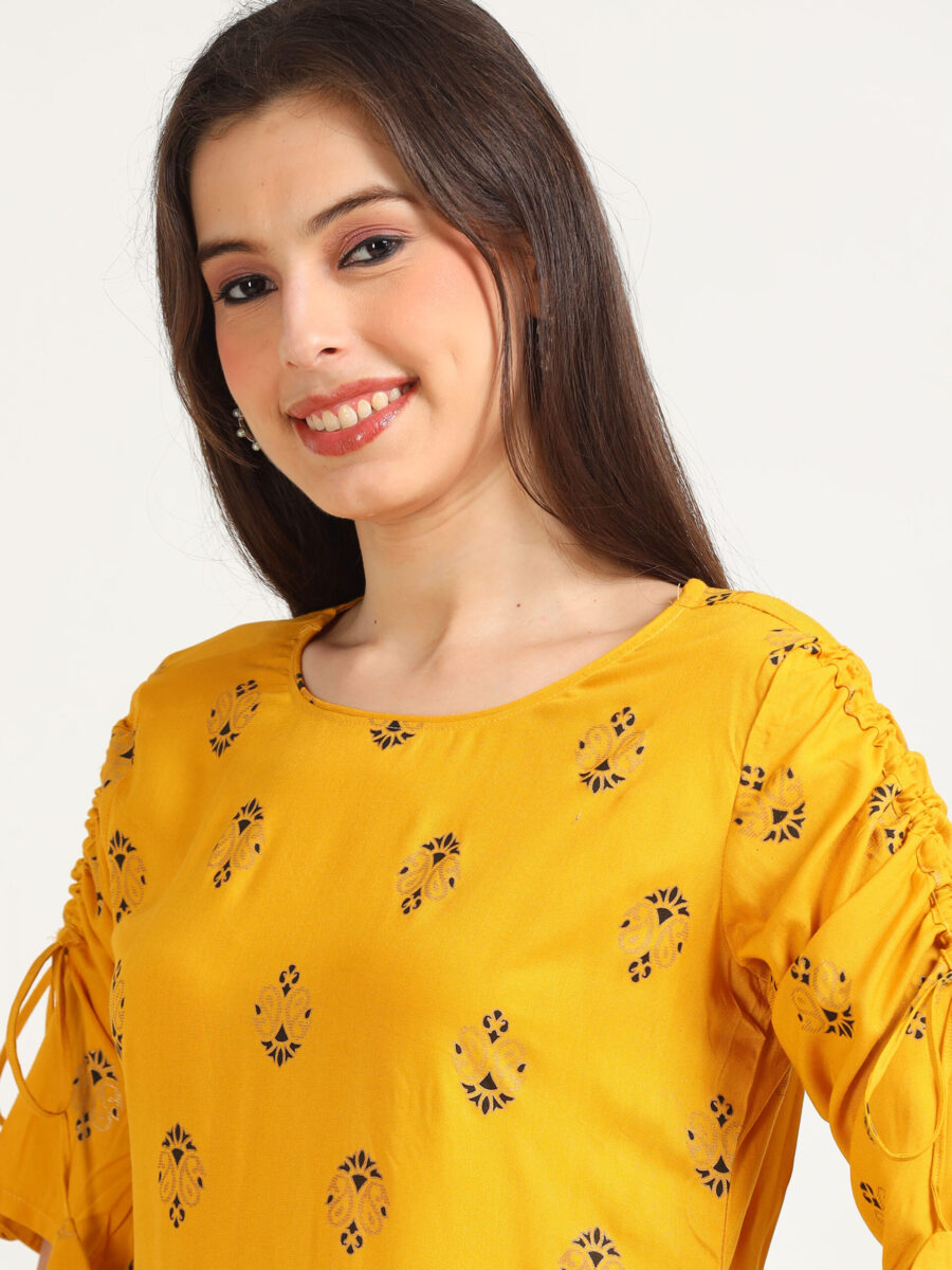 Add a touch of warm elegance to your wardrobe with the Marcia Mustard Printed Rayon Kurta. This kurta combines a rich mustard print with the flowing comfort of rayon.