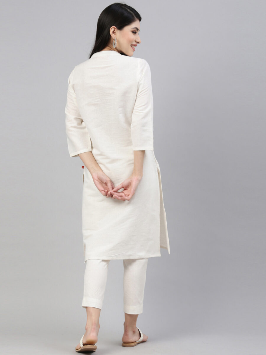 Discover a timeless ensemble. Introducing the Marcia White Printed Cotton Straight Kurta Set, a perfect combination of style and comfort. This set features a flowing white kurta adorned with intricate prints, paired with matching pants for a coordinated look.
