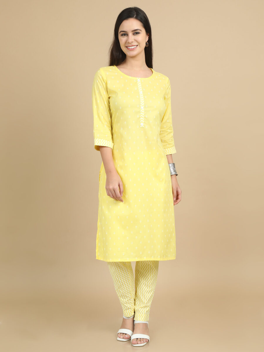 Radiate sunshine with the Marcia Yellow Printed Regular Kurti and Trousers set. The cheerful yellow hue, complemented by intricate prints, adds a touch of vibrancy to your wardrobe. The comfortable fit and high-quality fabric ensure all-day comfort and style.